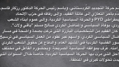 باسم حركة التجديد الكُردستاني، وباسم رئيس الحركة الدكتور رزگار قاسم، نتقدّم بأحرّ التعازي إلى عائلة الفقيد، وإلى رفاقه في حزب…